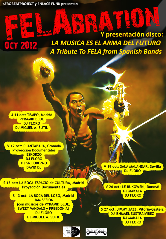 Un año más la asociación cultural AfrobeatProject y la revista Enlace Funk, se unen a la comunidad internacional del afrobeat para celebrar la FELAbration (El Día de FELA) que se viene organizando en ciudades como New York, Chicago, Oakland, Los Angeles, Austín, Atlanta, Washington, Boston, San Diego, México DF, Buenos Aires, Rio de Janeiro, Sao Paulo, Miami, Lagos, Paris, Londres, Madrid, Granada, Sevilla, Barcelona, Donosti o Vitoria-Gasteiz, para conmemorar el nacimiento del músico nigeriano Fela Anikulapo-Kuti que cumpliría 74 años.