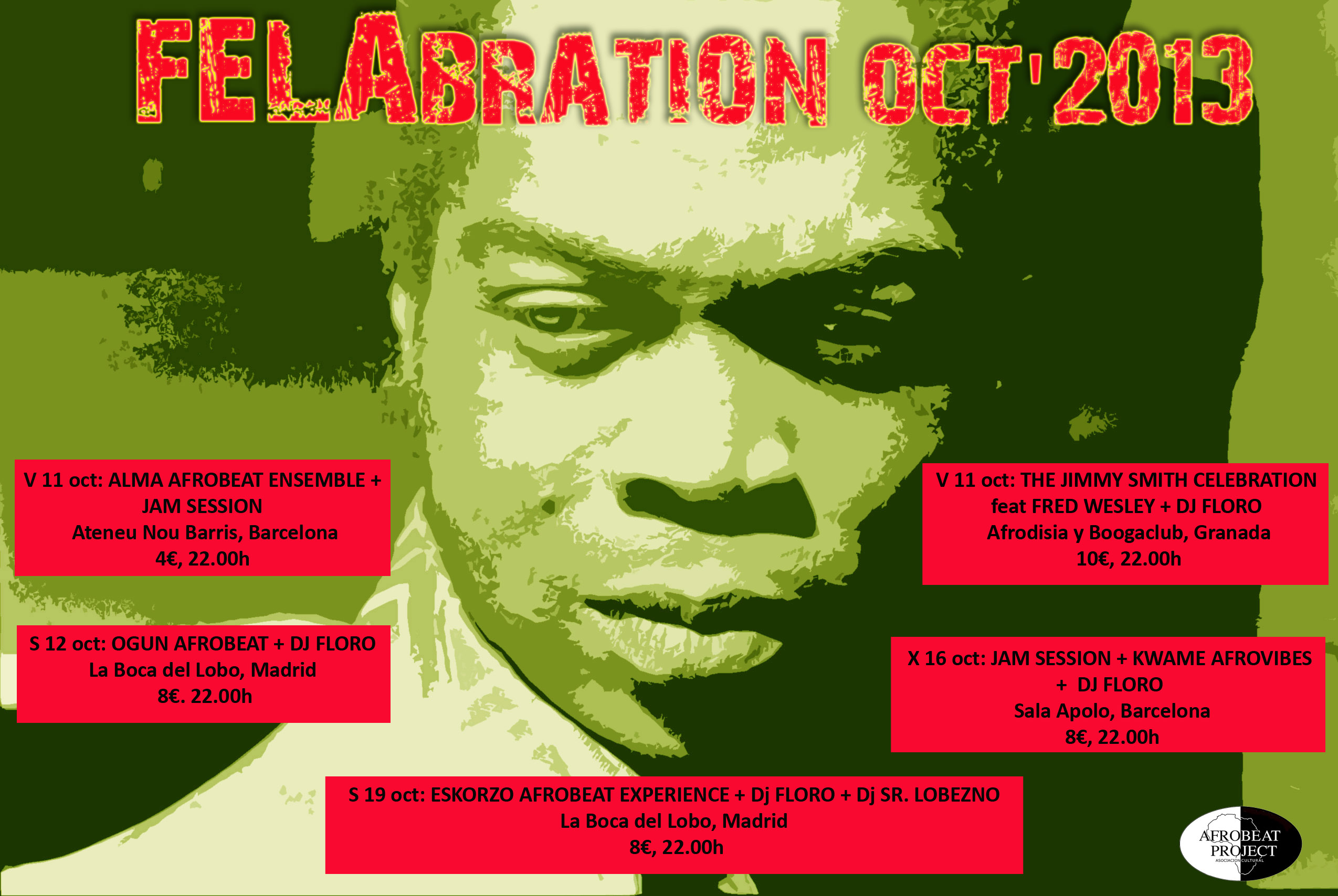 AfrobeatProject junto a Slow Walk Music y Enlace Funk, los grupos Alma Afrobeat Ensemble, The Jimmy Smith Celebration feat Fred Wesley, Kwame Afrovibes, Ogun Afrobeat y Eskorzo Afrobeat Experience, los Djs Floro y Sr Lobezno, y las salas Ateneu Nou Barris y Sala Apolo (Barcelona), La Boca del Lobo (Madrid), Afrodisia y Booga Club (Granada), se unen un año más a la celebración de la comunidad afrobeat internacional para recordar a este icono musical y cultural africano cuya influencia ha reverberado en muchas músicas y músicos a lo ancho y largo del planeta. Octubre se llama FELABRATION.