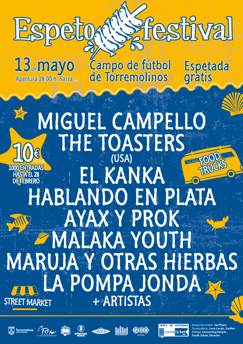 El cartel del II ESPETO FESTIVAL lo conforman: MIGUEL CAMPELLO, THE TOASTERS, EL KANKA, HABLANDO EN PLATA, AYAZ Y PROK, MALAKA YOUTH, MATUJA Y OTRAS HIERBAS, LA POMPA JONDA y más artistas por confirmar.